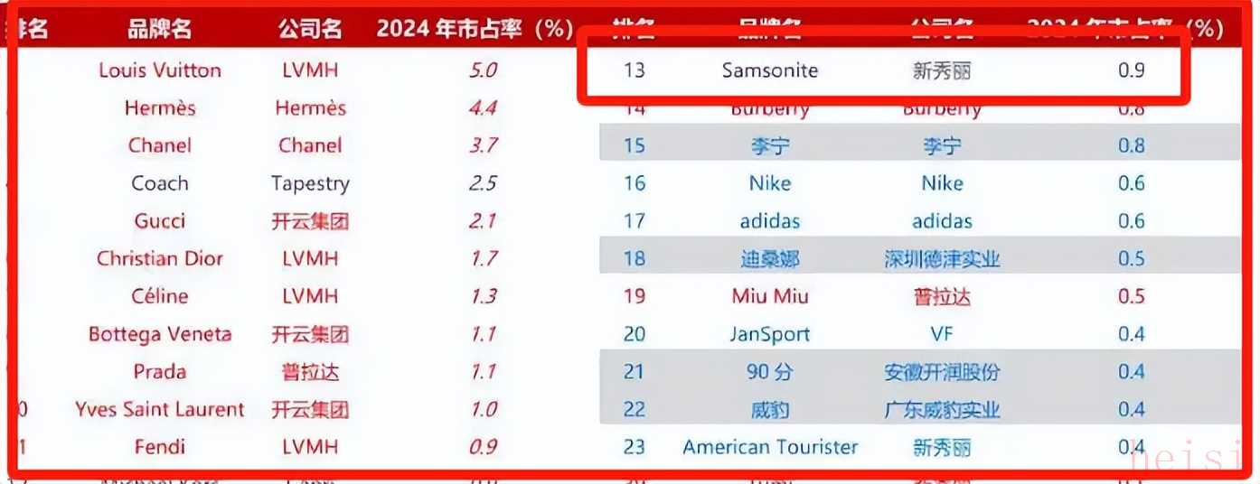 2024年中國箱包市占率,新秀麗跌出前13名。