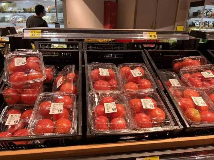 記者查看兩款定價(jià)不同的番茄,它們的產(chǎn)地都來(lái)自內(nèi)蒙古,供應(yīng)商也是同一個(gè),規(guī)格和包裝都一樣。區(qū)別是9.9元的那個(gè),比7.9元的價(jià)格,上市日期、包裝日期都新鮮了一天。