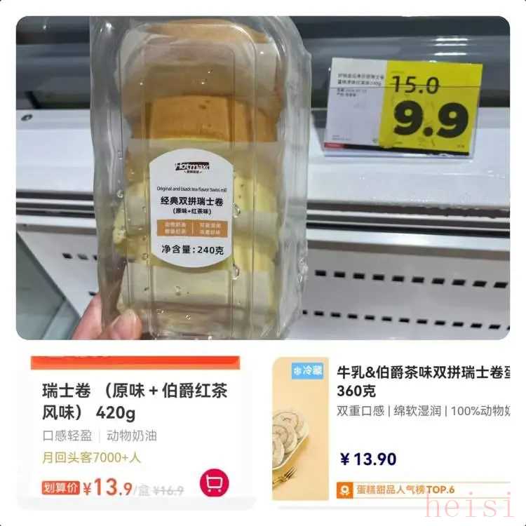 但瑞士卷的價(jià)格則無(wú)優(yōu)勢(shì)。標(biāo)注使用了動(dòng)物奶油的原味+紅茶味的雙拼瑞士卷,240克賣9.9元;與盒馬NB同口味雙拼420克13.9元、奧樂齊360克13.9元相比,換算為同規(guī)格后還是后兩者更劃算。
