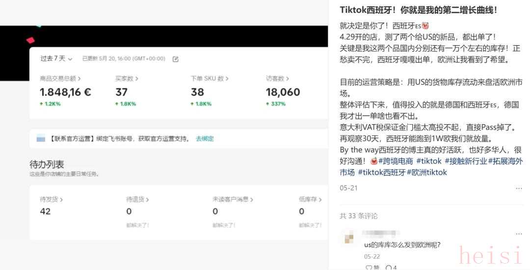 一位賣(mài)家在小紅書(shū)上分享自己在今年4月在TikTok西班牙小店的銷(xiāo)售情況。開(kāi)店不滿(mǎn)一個(gè)月,訪客數(shù)就已經(jīng)破萬(wàn),7天總GMV已經(jīng)接近 2000 歐元(約合1.66萬(wàn)元)。