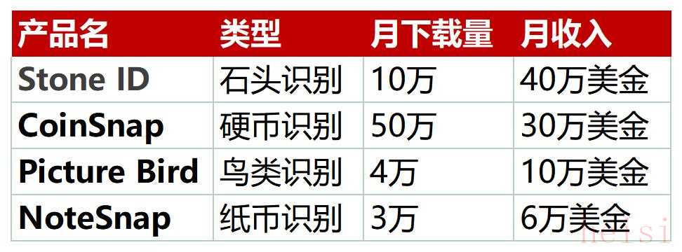 他們可不是湊數(shù)的,個個站出來都是“好兵”。其中,3款識別應(yīng)用月收入在10萬美金以上,石頭識別應(yīng)用的月收入達到40萬美金。