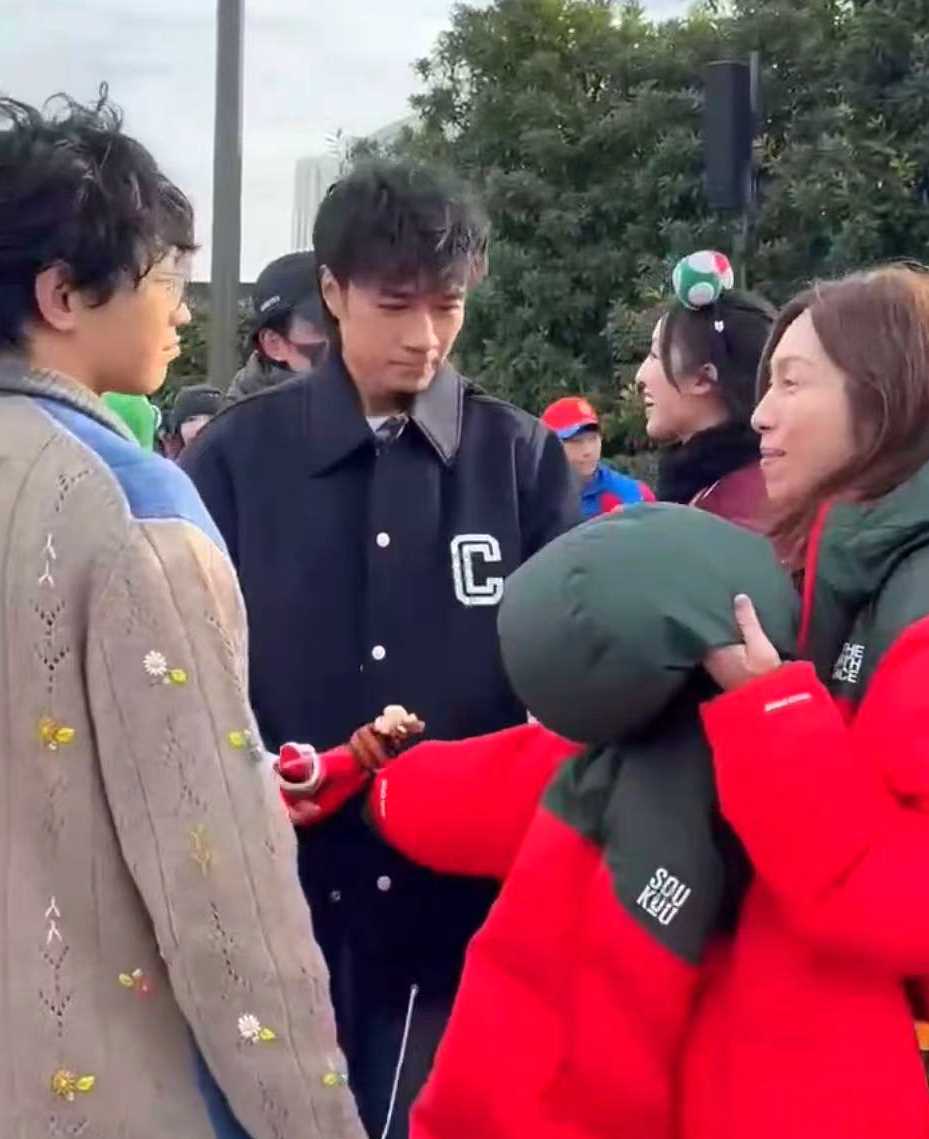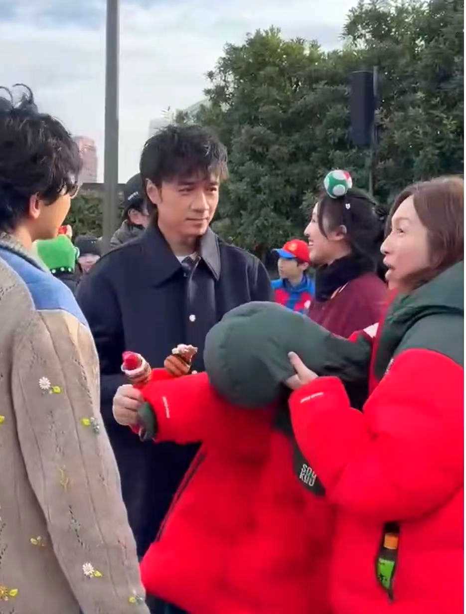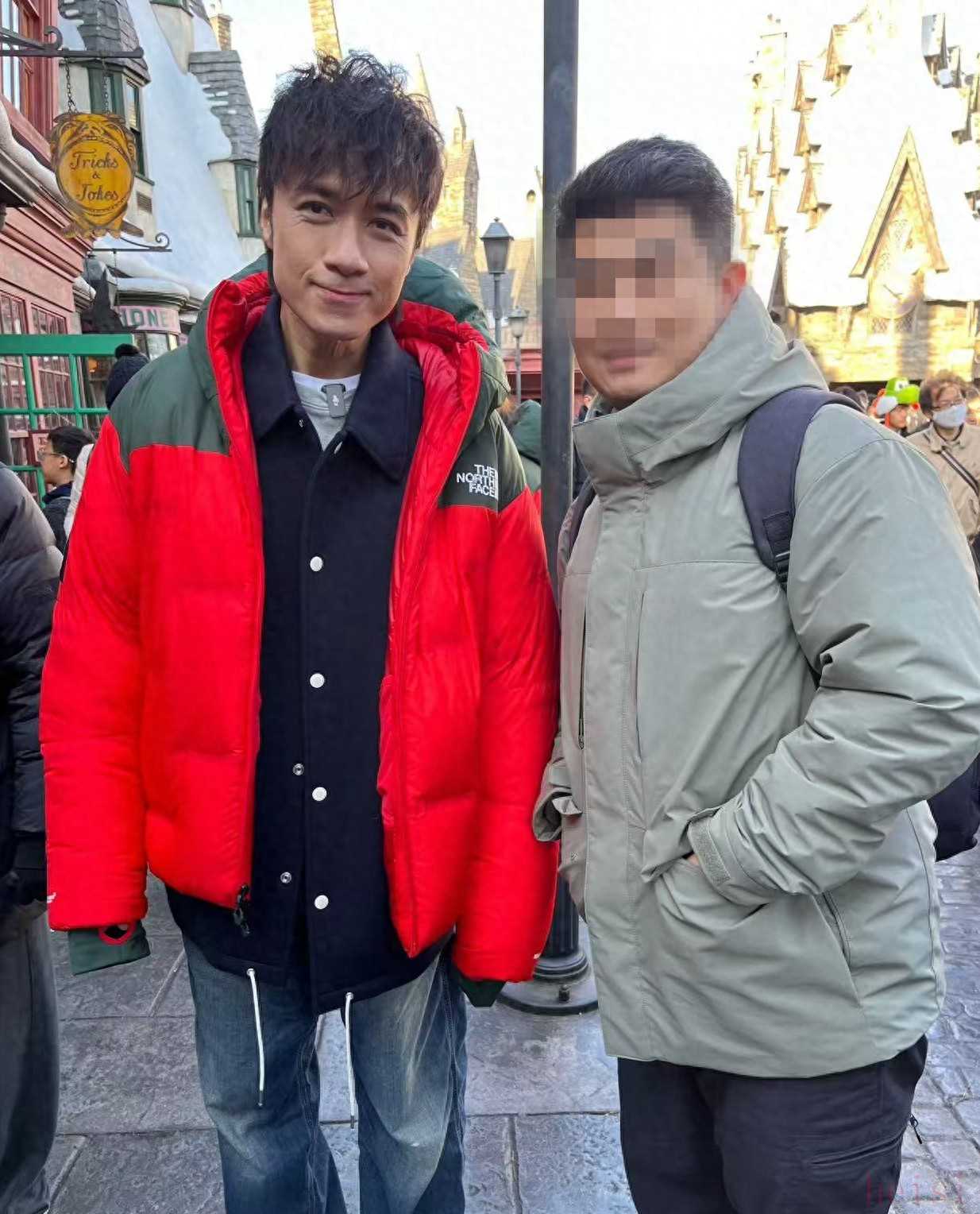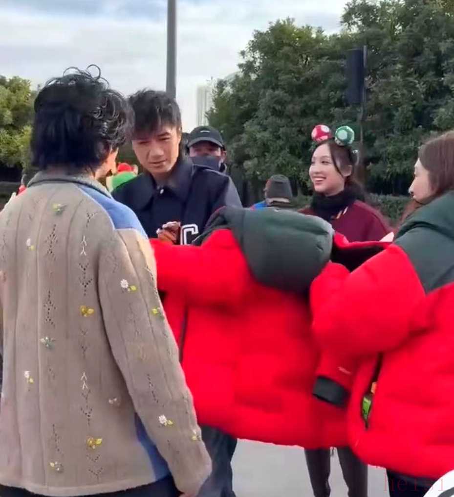 夫妻倆被路人抓拍到,難得同框,兩人穿著紅色的情侶羽絨服,有說有笑,默契十足。