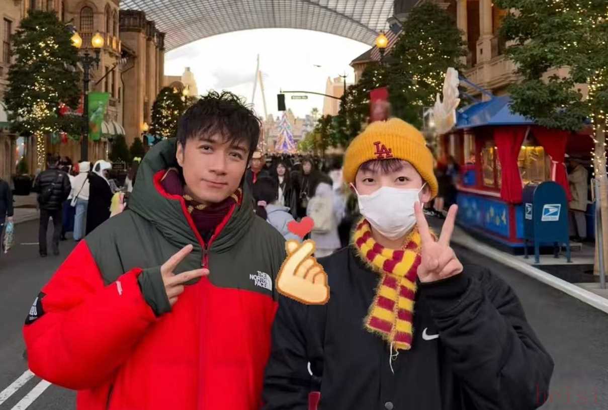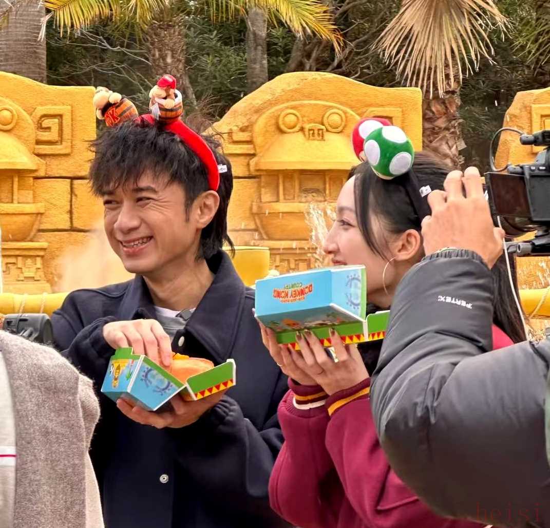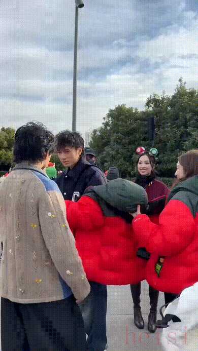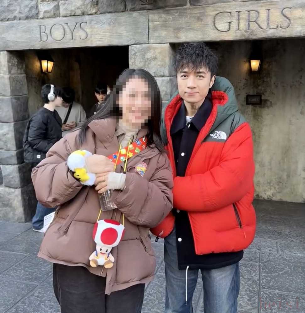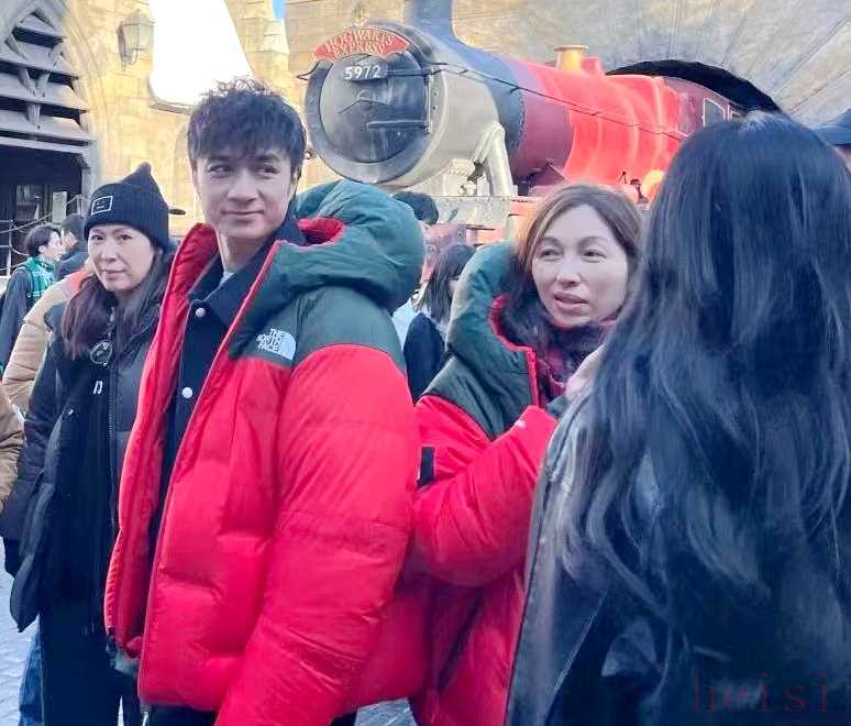 夫妻倆被路人抓拍到,難得同框,兩人穿著紅色的情侶羽絨服,有說有笑,默契十足。