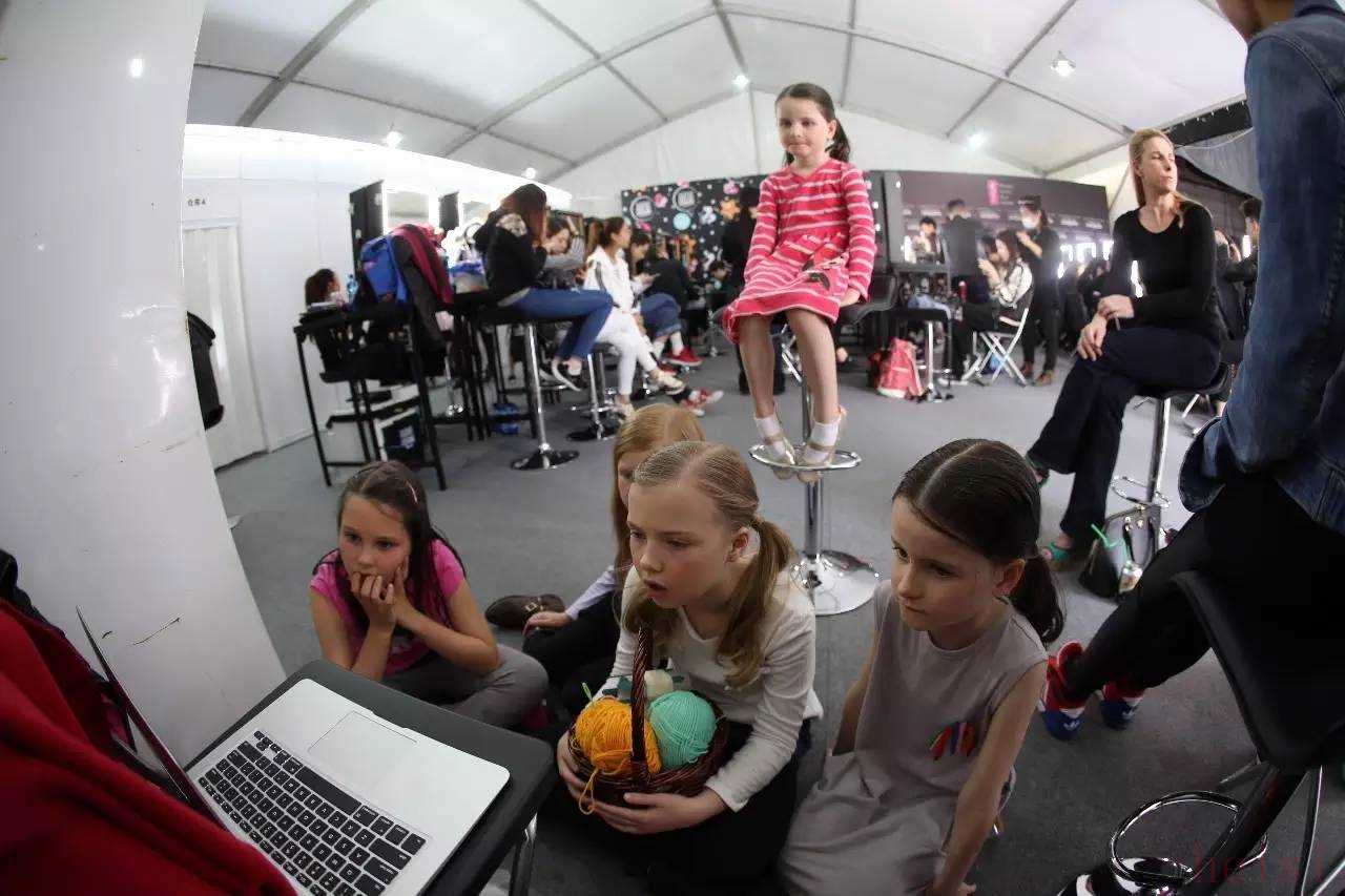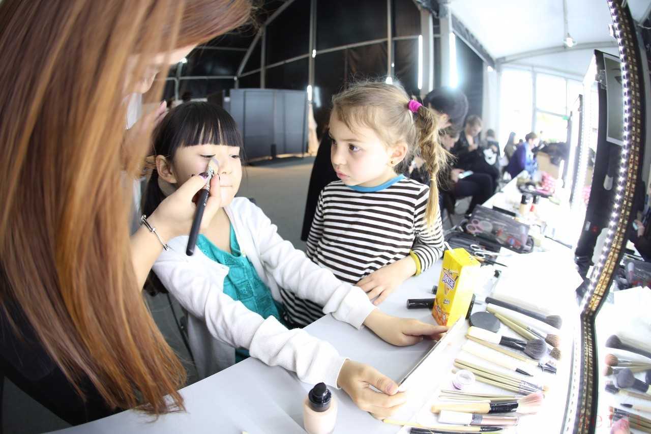 妝容與發(fā)型同樣決定著一場(chǎng)秀的呈現(xiàn)。忙碌的秀場(chǎng)后臺(tái),化妝師與模特正緊張地為L(zhǎng)ANYU大秀作著最后準(zhǔn)備。這場(chǎng)大秀中包括了不少可愛(ài)的小模特,有她們?cè)诘牡胤椒路鹁统錆M了童真可愛(ài)。