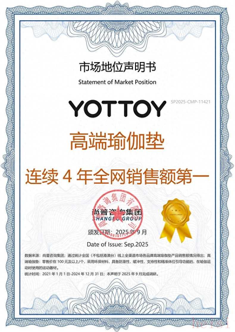 近期,尚普咨詢集團向上海方連實業(yè)有限公司(以下簡稱“方連實業(yè)”)旗下品牌YOTTOY的高端瑜伽墊和泡沫軸產(chǎn)品頒發(fā)市場地位聲明。此次,經(jīng)過嚴(yán)密的數(shù)據(jù)考證,尚普咨詢集團確認(rèn)向YOTTOY授予【YOTTOY高端瑜伽墊連續(xù)4年全網(wǎng)銷售額第一】及【YOTTOY泡沫軸連續(xù)4年全網(wǎng)銷量第一】權(quán)威聲明。YOTTOY的高端瑜伽墊和泡沫軸憑借對環(huán)保、美學(xué)和輕運動生活方式的思考;以出色的防滑、回彈、環(huán)保安全材質(zhì)深受用戶喜愛。
