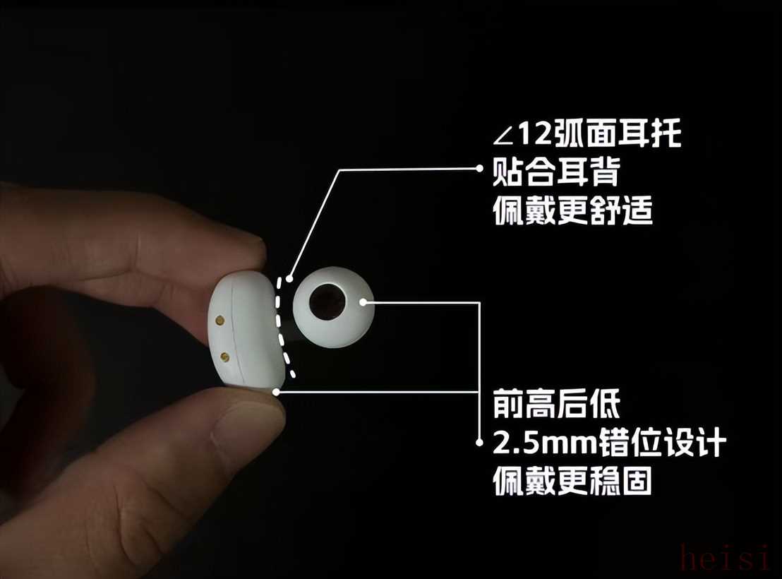 佩戴設(shè)計(jì)特別貼心,耳機(jī)用了 2.5mm 的錯(cuò)位設(shè)計(jì),戴在耳朵上是前高后低的樣子,特別貼合耳朵形狀,戴著特別穩(wěn);還有 12° 的弧面耳托,把耳機(jī)電池那塊做成了弧形,能貼緊耳背,舒服度又上了一個(gè)臺(tái)階;單個(gè)耳機(jī)才 4.5 克,就算戴好久,耳朵也沒啥負(fù)擔(dān),完全不會(huì)有壓迫感。