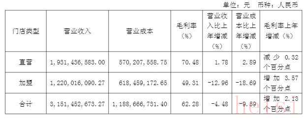 直營(yíng)與加盟模式的毛利率差距更為明顯。
