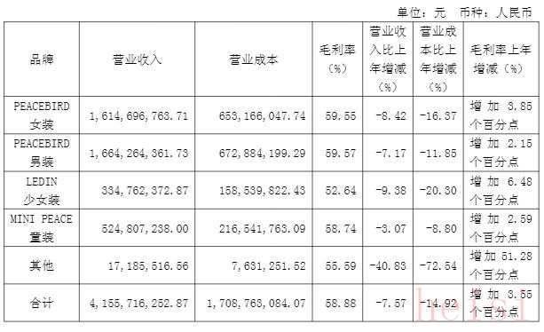 報(bào)告期內(nèi),太平鳥四大品牌業(yè)務(wù)線較去年同期全線下跌:PEACEBIRD女裝收入下降8.42%、PEACEBIRD男裝下降7.17%、LEDIN少女裝下降9.38%,MINI PEACE童裝下降3.07%。