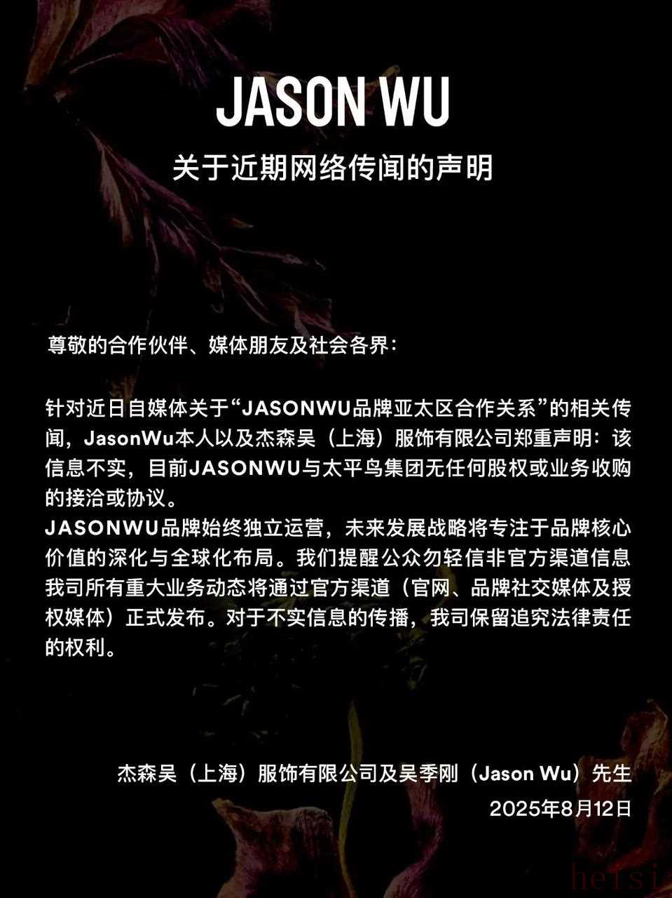 收購成熟高端品牌確實(shí)是服裝企業(yè)常用的升級(jí)路徑。在業(yè)內(nèi)認(rèn)為太平鳥或?qū)⑼ㄟ^收購Jason Wu探索高端女裝業(yè)務(wù)線時(shí),這一收購很快陷入“羅生門”。Jason Wu官方聲明稱,“品牌與太平鳥集團(tuán)無任何股權(quán)或業(yè)務(wù)收購的接洽或協(xié)議”。