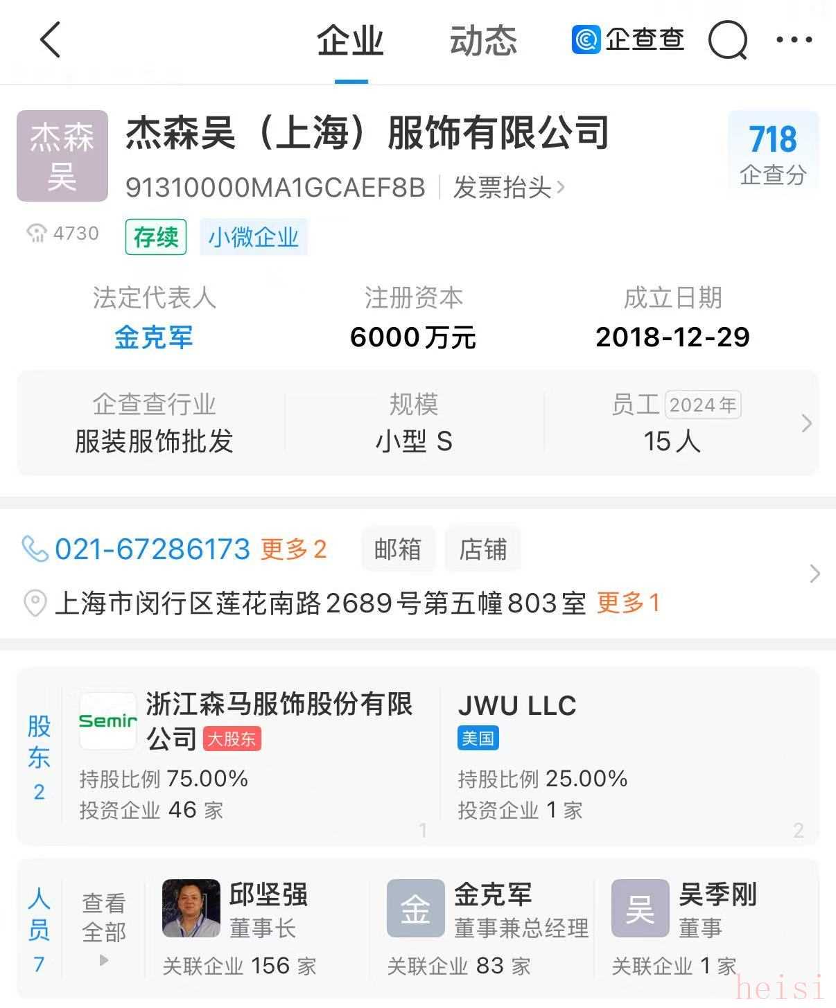 實(shí)際上,Jason Wu的背后早已有另一傳統(tǒng)服飾巨頭森馬的身影。據(jù)企查查數(shù)據(jù)顯示,Jason Wu在中國(guó)市場(chǎng)的運(yùn)營(yíng)公司為杰森吳(上海)服飾有限公司,股東是浙江森馬服飾股份有限公司和JWU LLC(Jason Wu美國(guó)公司),二者分別持股75%和25%。杰森吳的董事長(zhǎng)由森馬董事長(zhǎng)邱堅(jiān)強(qiáng)擔(dān)任。