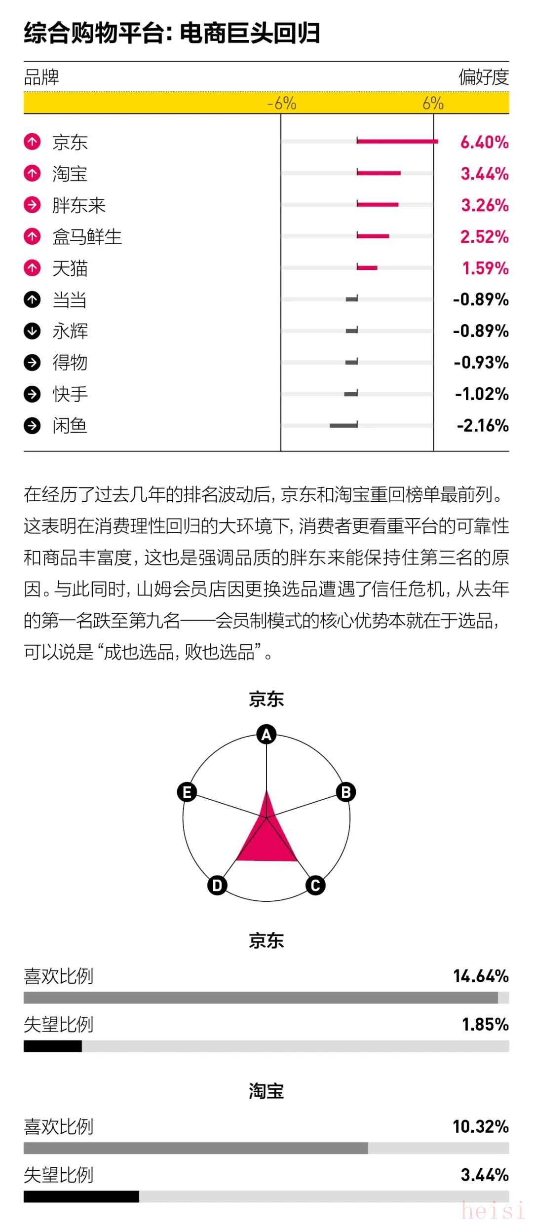 *注:偏好度=(愿意推薦比例-失望比例)×50% ;每個(gè)品類下有10-40個(gè)不等的被調(diào)研品牌;考慮到版面限制,制表時(shí)我們僅選取了每個(gè)品類的前五名和倒數(shù)五名;藍(lán)點(diǎn)從上到下為該品類第一至第五名;黑點(diǎn)從下到上為該品類最后一名至倒數(shù)第五名,中間名次略去;品牌名稱前圓圈中的箭頭反映了該品牌相較去年的排名變化;☆指新加入品牌。(下同)雷達(dá)圖圖例:A:品牌理念B:設(shè)計(jì)C:產(chǎn)品D:渠道E:營(yíng)銷