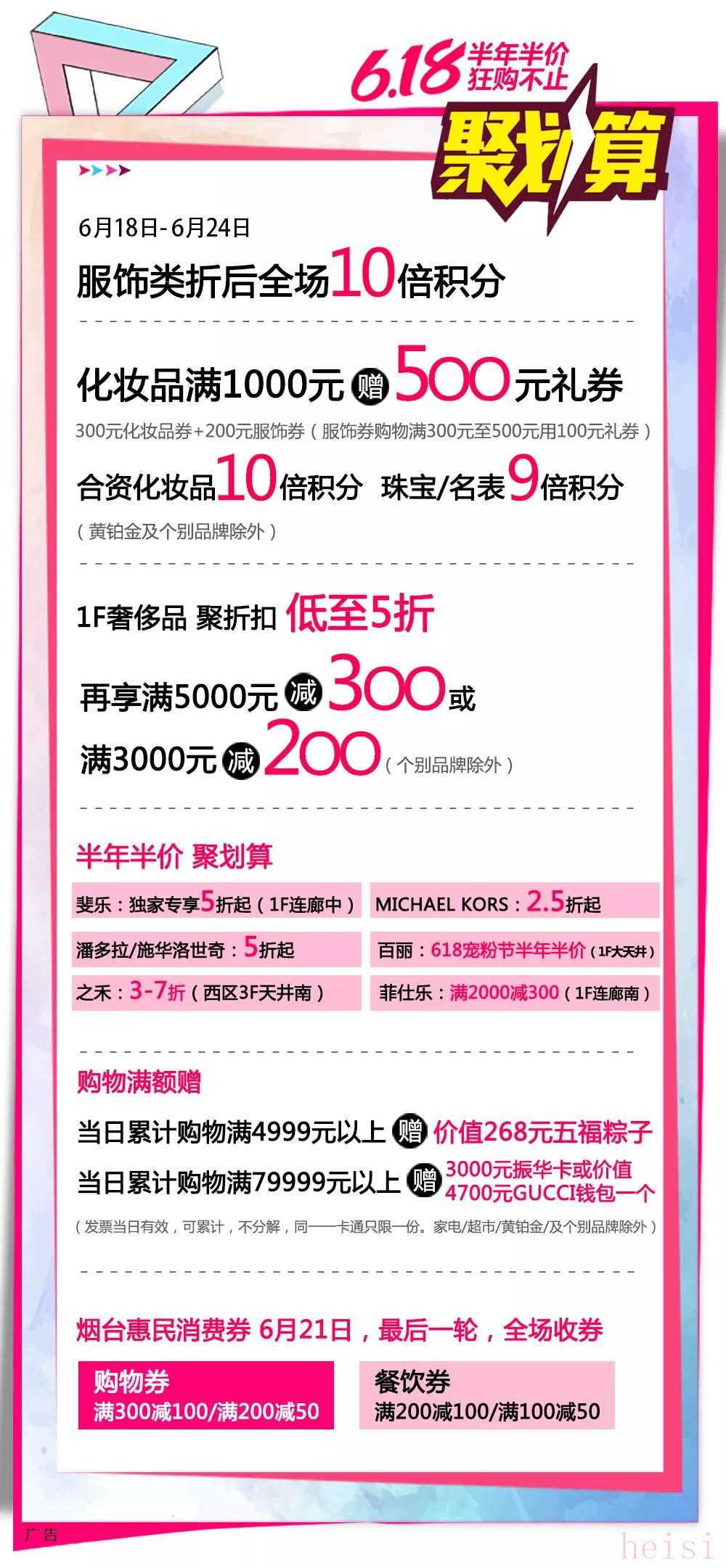 六福:6月18日-25日,黃金每克減35元,鉑金每克減30元,鑲嵌k金8折,6.18當(dāng)天黃金每整克減68元,鑲嵌k金8.5折,折上折每滿1000減120