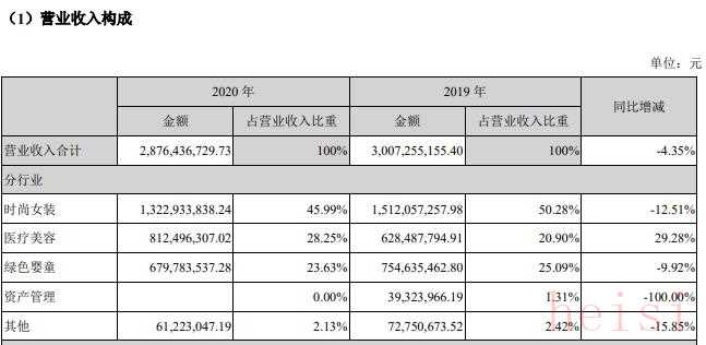 但近幾年,受高端女裝行業(yè)競爭激烈、龍頭企業(yè)市場份額優(yōu)勢不明顯、消費模式變化等市場環(huán)境影響,朗姿股份女裝業(yè)務開始走下坡路。根據(jù)公司最新的年報數(shù)據(jù)顯示,2020年其營業(yè)收入為28.76億元,服裝板塊的營業(yè)收入為19.85億元,醫(yī)美板塊的營業(yè)收入為8.14億元,同比上升29.28%。其中,女裝業(yè)務收入為13.2億,占總營收比重僅為46%,較去年同期下降了12.51%。