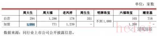截至2016 年6月30日,周大生擁有自營(yíng)店294家,加盟店1994家,相比其他兩家周姓珠寶店,加盟店占主流。對(duì)比如下: