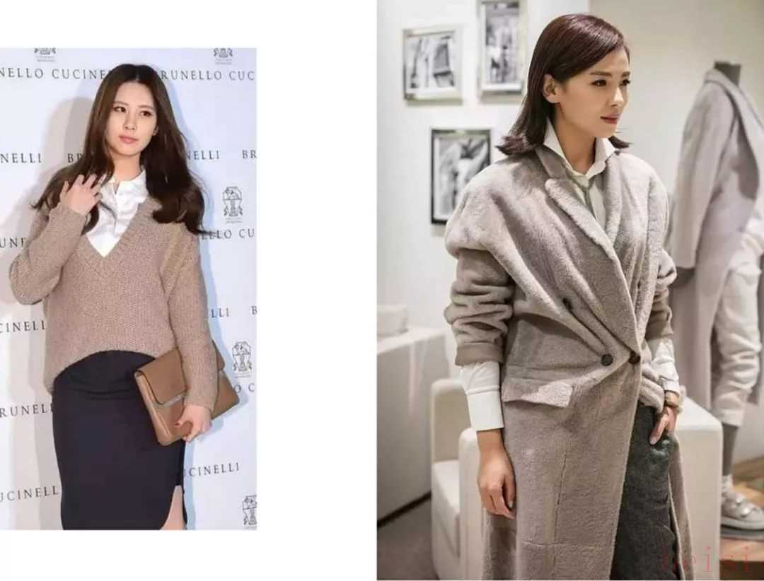 而Brunello Cucinelli這個(gè)品牌可以說是劉濤的最愛了,濤姐的私櫥里一大半歐式他家的羊絨衫,只要簡(jiǎn)單的搭配一件襯衫,就能分分鐘穿出氣場(chǎng)穿出高級(jí)感,所以Brunello Cucinelli最有名的搭配方法就是襯衫搭配羊絨衫。這樣的疊穿會(huì)增強(qiáng)整體LOOK的時(shí)髦感,不信你看少女時(shí)代的徐賢亮,絕對(duì)就是對(duì)羊絨衫最好的示范。