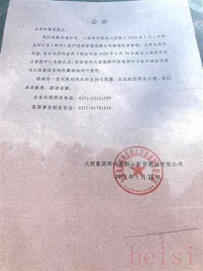 根據(jù)張貼在紫荊山店門口的公告內(nèi)容顯示,大商鄭州紫荊山店將于2020年6月1日轉(zhuǎn)至時計寶(鄭州)房地產(chǎn)經(jīng)營管理有限公司持續(xù)經(jīng)營。同時稱消費者的會員卡積分可以在2020年6月30日前至大商國貿(mào)店客服中心兌換禮品,預付卡可在河南范圍內(nèi)大商使用。