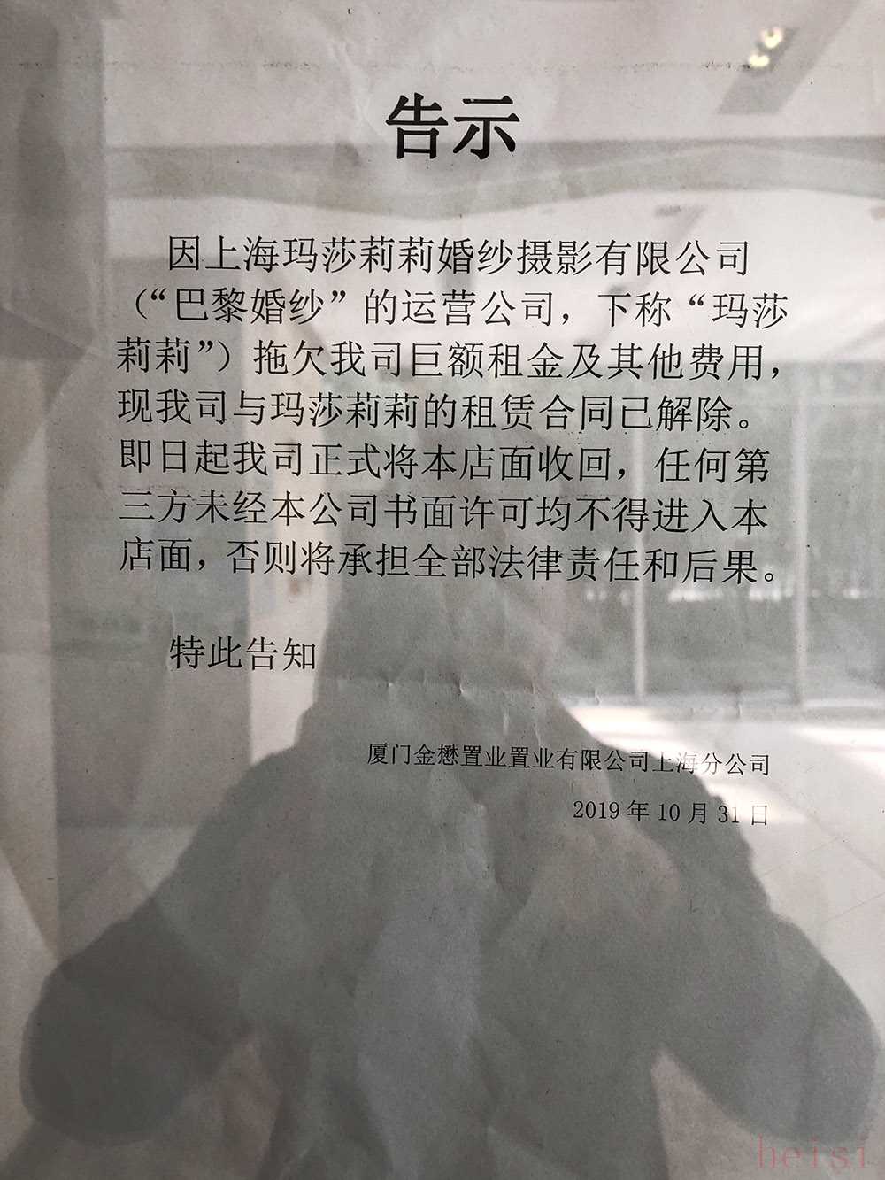 大渡河路門(mén)店關(guān)了門(mén)后,門(mén)口張貼著大樓物業(yè)公司收回店面的告示。物業(yè)稱(chēng),巴黎婚紗的運(yùn)營(yíng)公司已拖欠了巨額租金及其他費(fèi)用。印證了傳言。