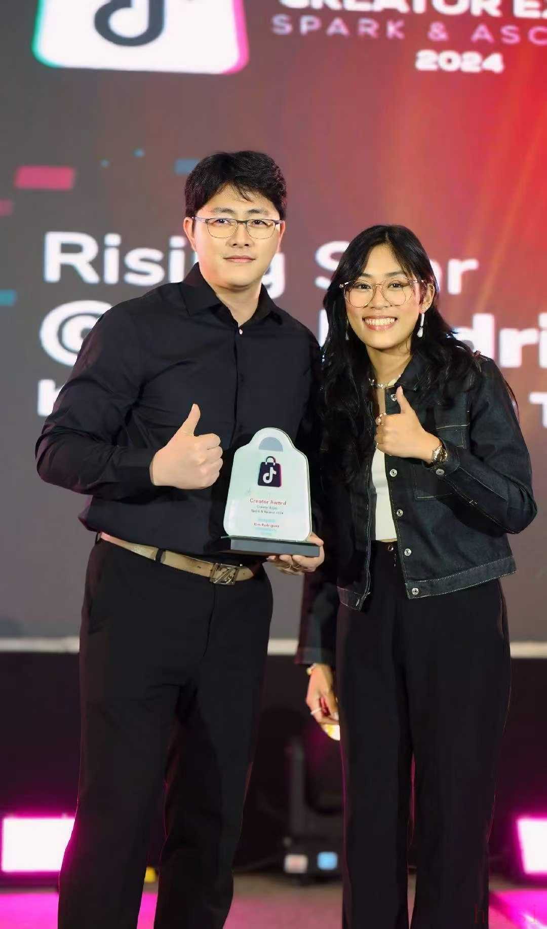 施建華(左)代表驛淘科技領(lǐng)取TikTok菲律賓新銳達人機構(gòu)獎。