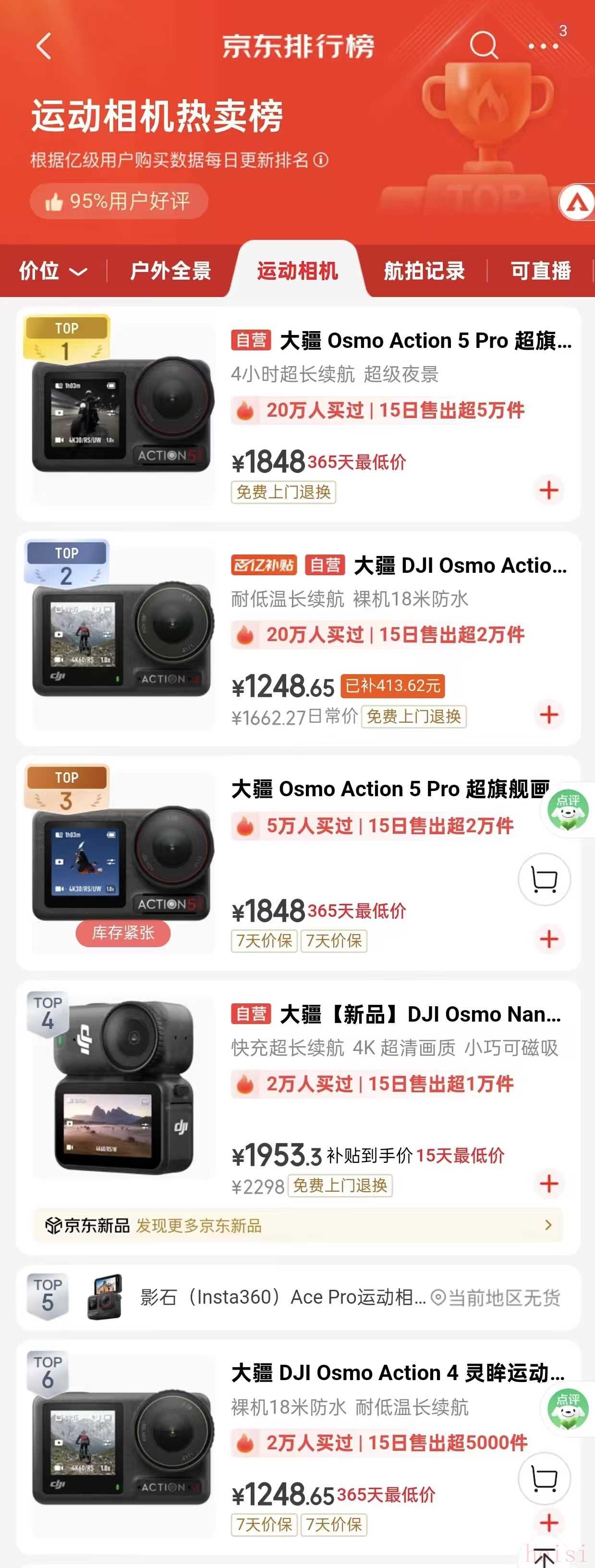 這確實(shí)是一個(gè)非常積極的信號(hào)!大疆(DJI)全景相機(jī)和運(yùn)動(dòng)相機(jī)在京東熱賣榜上均排品類第一,并且銷量“賣爆了”,這說明: