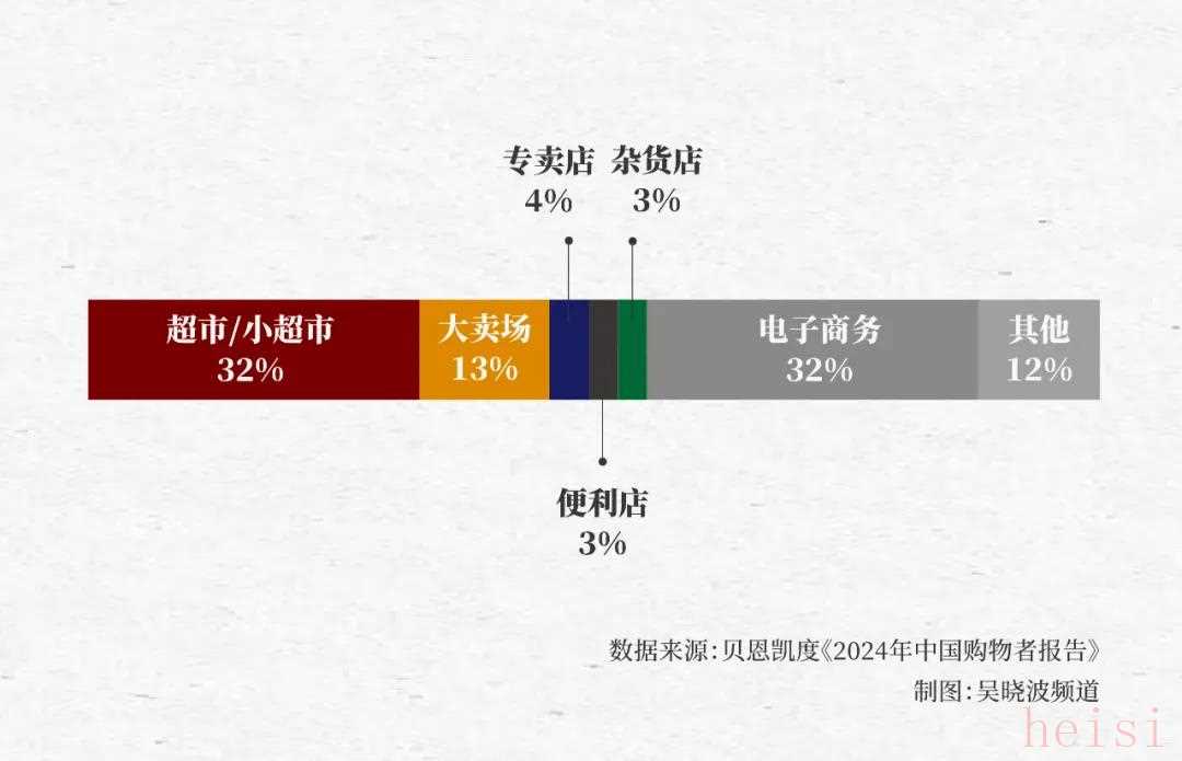 貝恩凱度《2024年中國(guó)購(gòu)物者報(bào)告》顯示:2024年前三季度,超市/小超市(32%)、大賣(mài)場(chǎng)(13%)、專(zhuān)賣(mài)店(4%)、便利店(3%)、雜貨店(3%)在城鎮(zhèn)快消市場(chǎng)銷(xiāo)售額合計(jì)占比達(dá)到55%。