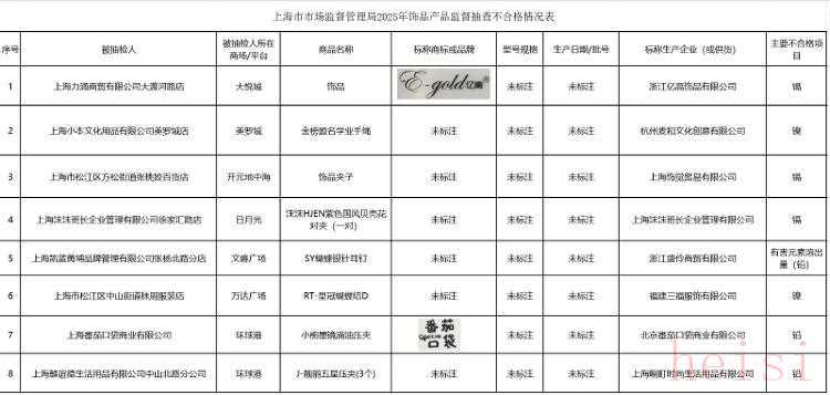 在飾品監(jiān)督抽查中,上海市市場(chǎng)監(jiān)管局對(duì)寶山、奉賢、虹口等13個(gè)區(qū)28家企業(yè)銷(xiāo)售的19個(gè)品牌50批次飾品進(jìn)行了監(jiān)督抽查。經(jīng)檢測(cè),有8批次不合格,不合格檢出率為16.0%。