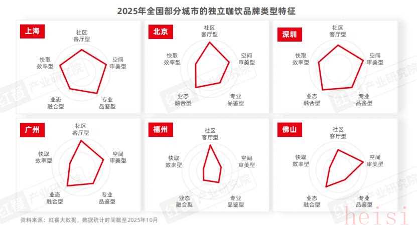 從不同城市的獨立咖飲品牌類型分布來看,上海、深圳、廣州、北京的獨立咖飲品牌類型更為多元,呈現(xiàn)“審美+專業(yè)+業(yè)態(tài)融合”的發(fā)展趨勢;而福州、佛山則在個別類型上形成局部優(yōu)勢。