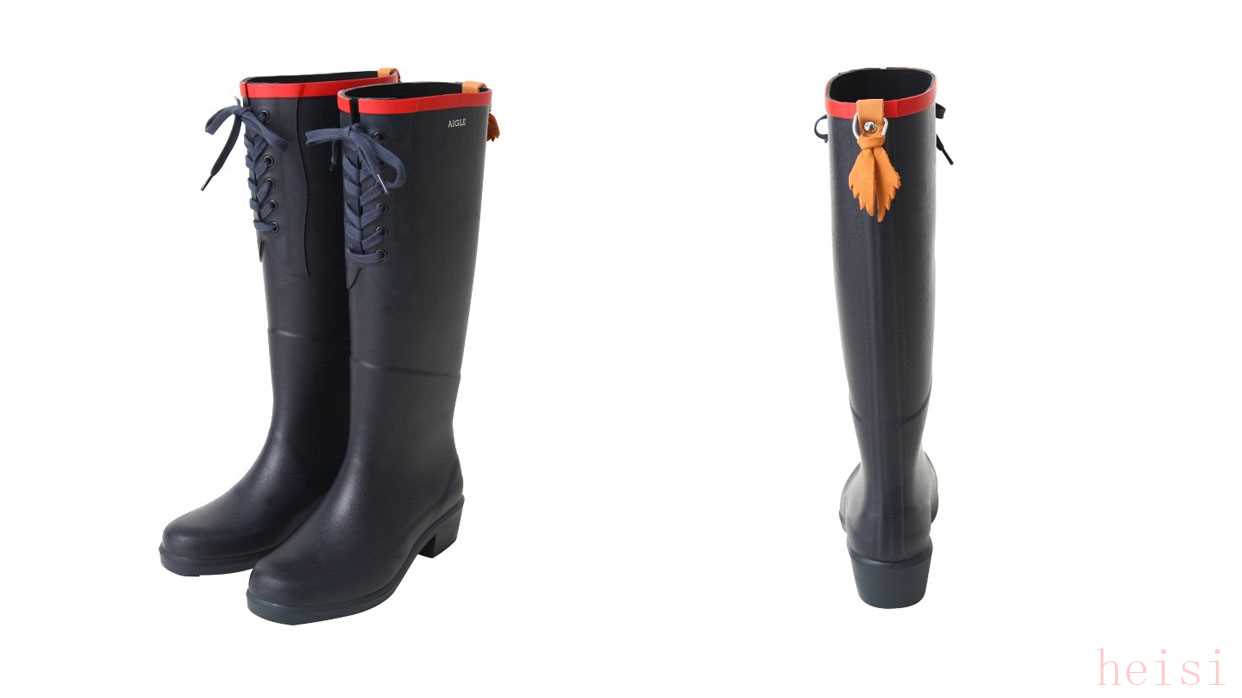 這款雨靴的靴口有一道紅圈,黑色的靴身搭配深藍(lán)色鞋帶,靴子背后的靴口處附有姜黃色的皮質(zhì)翅膀裝小飄帶,十分討巧可愛(ài)。