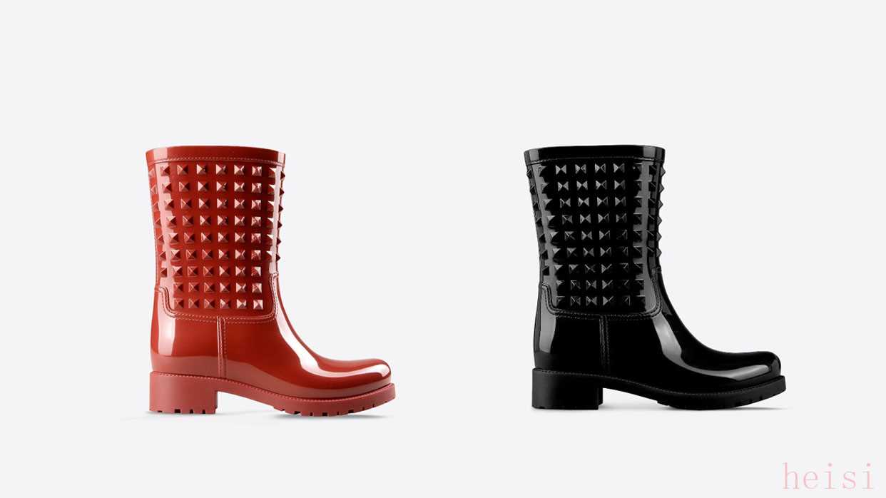 PVC 質(zhì)地的鉚釘中筒雨靴,漆皮質(zhì)感,黑紅兩色,上面的鉚釘也都是 PVC 質(zhì)地。鞋頭很俏皮,鉚釘雖然是 PVC 質(zhì)地但質(zhì)感依然棒棒噠,應(yīng)該很對(duì) V 家鉚釘?shù)乃乐曳鄣奈缚凇?/p>