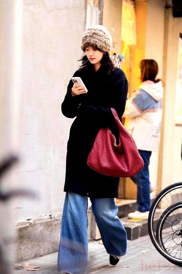 包包別背太大。長大衣視覺體積已經(jīng)夠滿,再掛一只托特,像扛麻袋。選腋下包,帶子縮短,包身貼在大衣外側(cè),重心提高,人看起來精神。顏色要么和鞋子順色,要么跳一個亮色,照片里才有焦點。