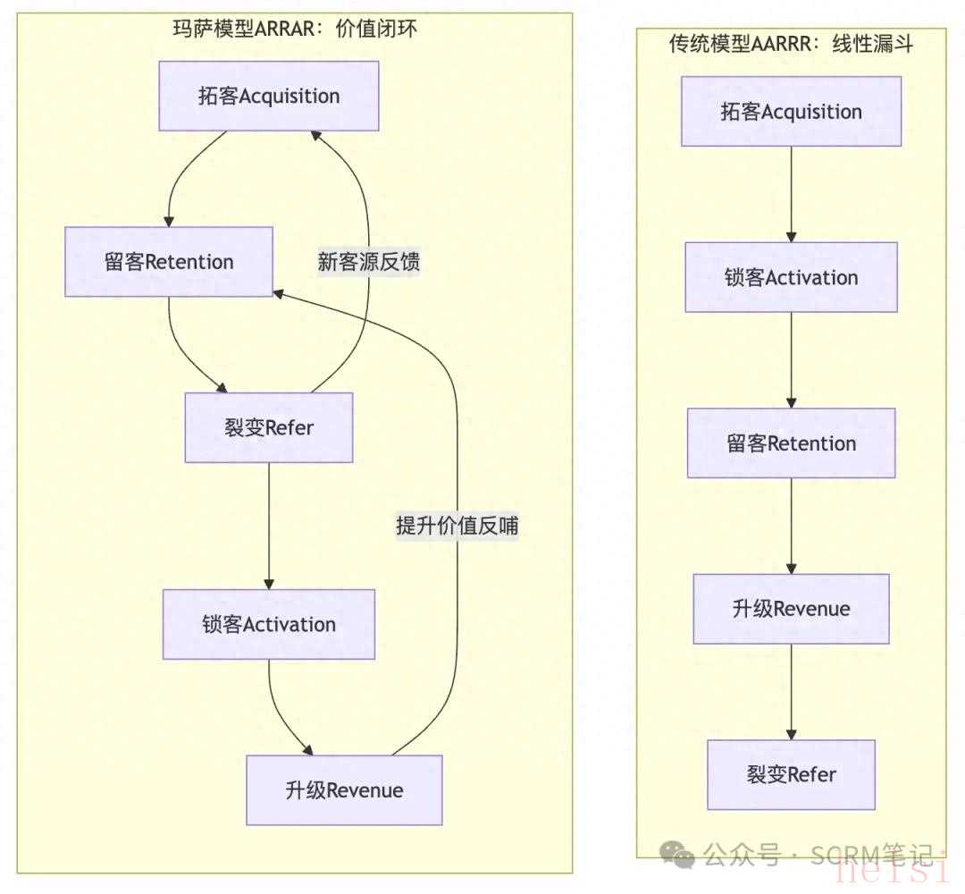 瑪薩美容集團(tuán)創(chuàng)新的“拓留裂鎖升”(ARRAR)模型,并非對(duì)傳統(tǒng)“拓鎖留升裂”(AARRR)模型的簡(jiǎn)單詞語重組,而是一次戰(zhàn)略重心和運(yùn)營(yíng)邏輯的根本性升級(jí)
