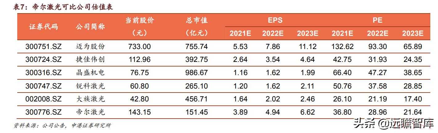 采用 Wind 一致預(yù)期,可比公司 2022 年 PE 均值為 46 倍,最高值為 93 倍,最低值為 21 倍,帝爾激光為 29 倍。