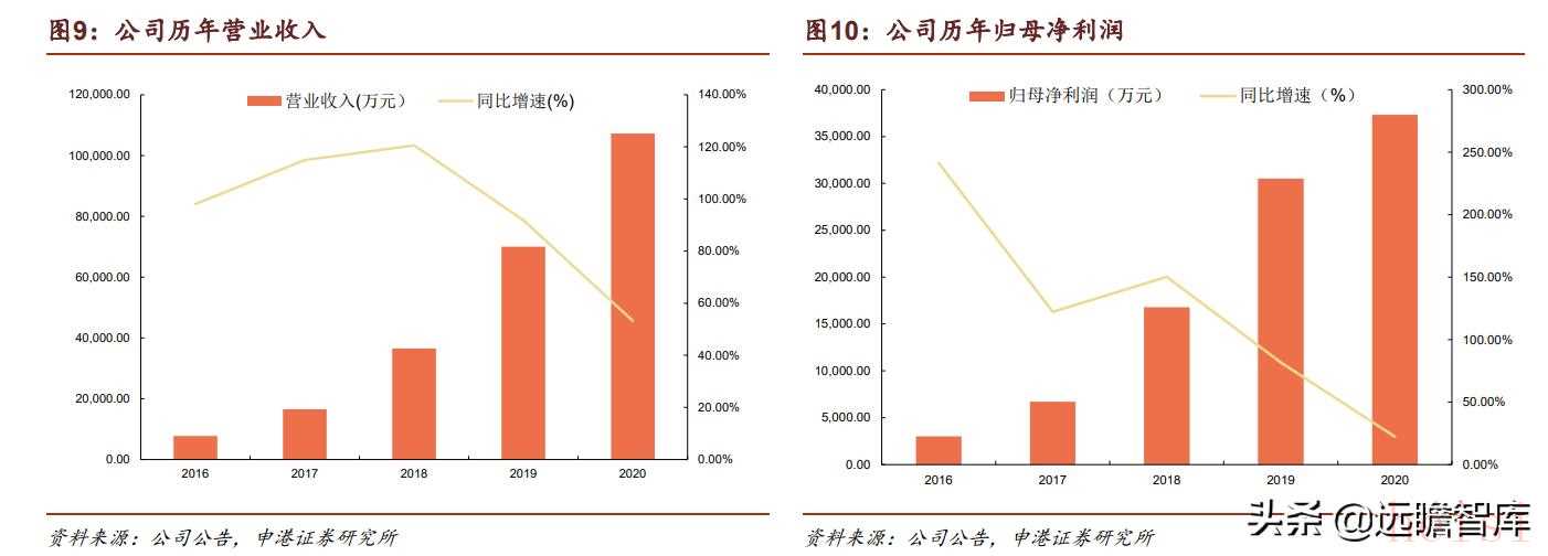 2016~2020 年公司營(yíng)業(yè)收入從 7,696.37 萬(wàn)元增長(zhǎng)到 107,228.33 萬(wàn)元,五年 CAGR 高達(dá) 93.2%;公司歸母凈利潤(rùn)從 3,020.35 萬(wàn)元增長(zhǎng)到 37,315.48 萬(wàn)元,五年 CAGR 高達(dá) 87.5%