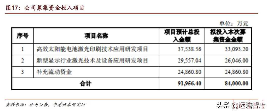公司于 2021 年 8 月成功發(fā)行 8.4 億元可轉(zhuǎn)換公司債券,募集資金將用于“高效太陽(yáng)能電池激光印刷技術(shù)應(yīng)用研發(fā)項(xiàng)目”、“新型顯示行業(yè)激光技術(shù)及設(shè)備應(yīng)用研發(fā)項(xiàng)目”、“補(bǔ)充流動(dòng)資金”。