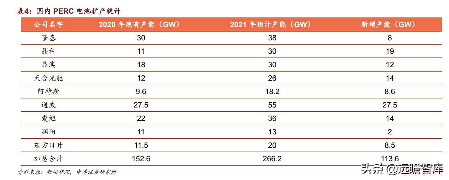 我們統(tǒng)計(jì)了 PERC+、TOPCon、異質(zhì)結(jié)高效太陽(yáng)能電池產(chǎn)能擴(kuò)建情況。PERC 產(chǎn)能進(jìn)一步擴(kuò)張。一方面,大尺寸帶來(lái) PERC 一波新產(chǎn)能擴(kuò)張需求;另一方面,電池廠商繼續(xù)擴(kuò)產(chǎn) PERC 也為 TOPCon 的升級(jí)預(yù)留了空間。