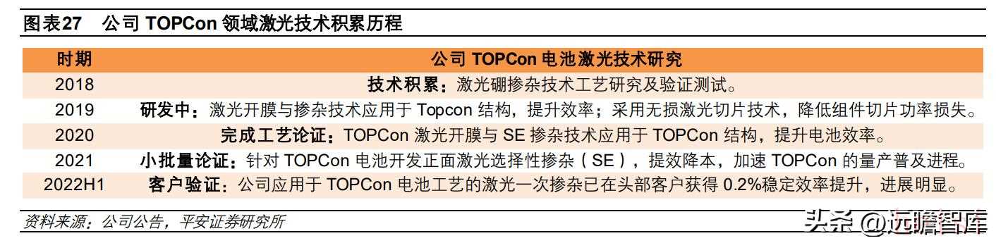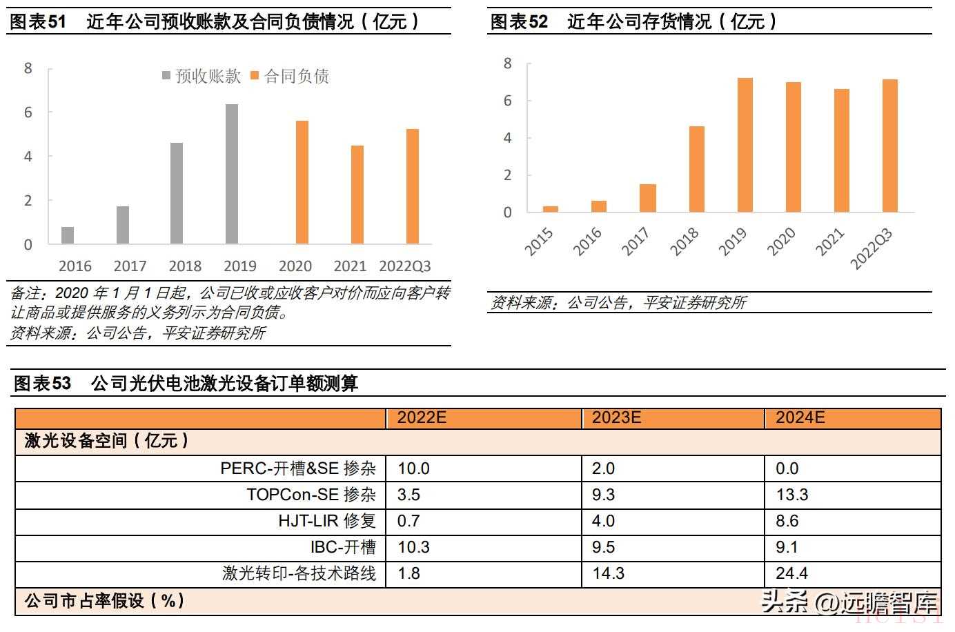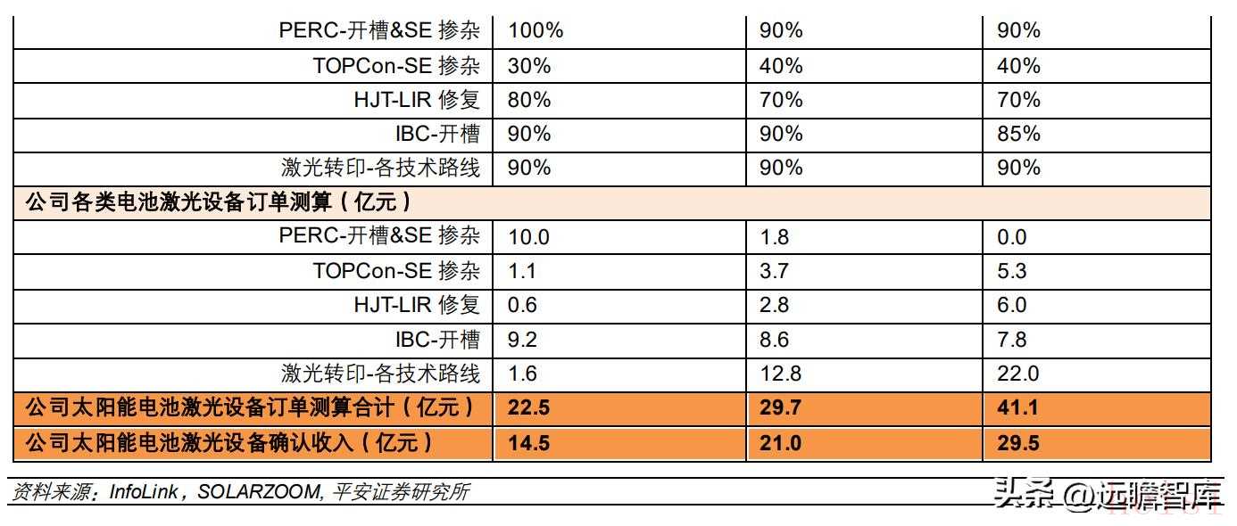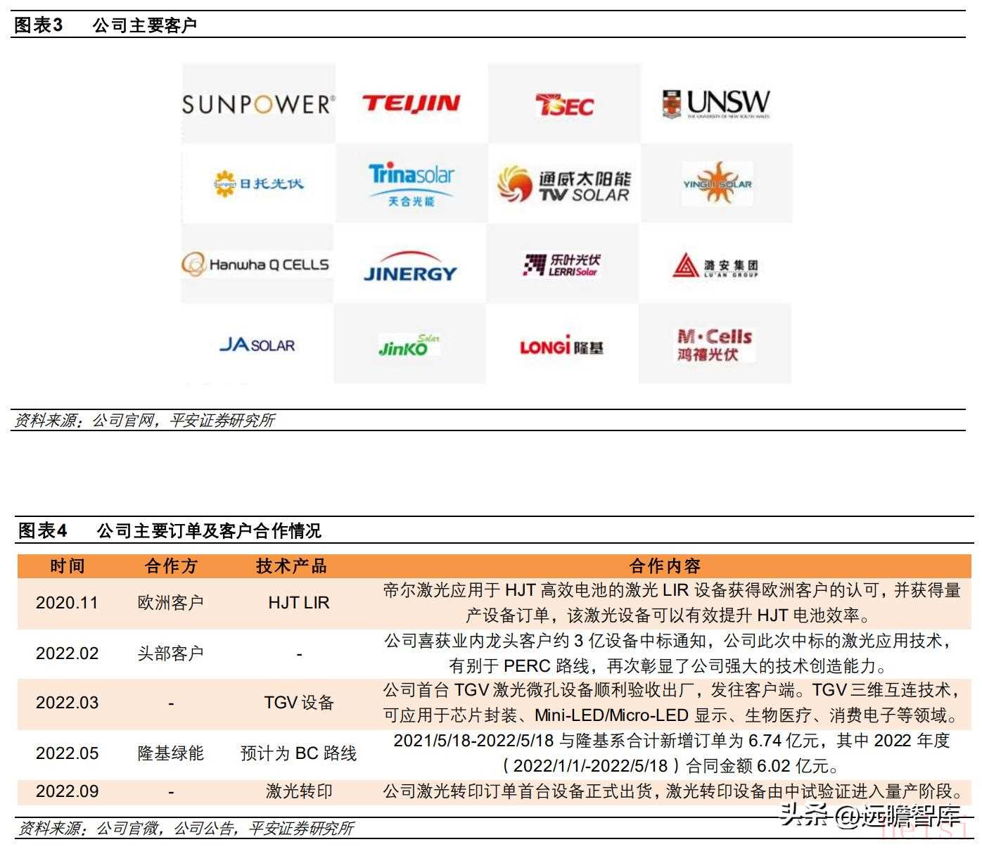 公司自成立以來,前瞻性地布局了 PERC 及 N 型電池激光技術(shù)方案,通過率先推出技術(shù)領(lǐng)先的量產(chǎn)型 PERC 激光開槽、SE 激光摻雜設(shè) 備,迅速導(dǎo)入下游產(chǎn)線,實現(xiàn)與客戶工藝磨合與適配并形成定制方案,由于降本增效效果優(yōu)于競爭對手,市占率極大提升;同時,在 N 型 TOPCon SE、IBC 精細開槽、HJT LIR 修復(fù)、激光轉(zhuǎn)印以及鈣鈦礦激光設(shè)備領(lǐng)域,公司商業(yè)化進展繼續(xù)保持領(lǐng)先,有望延續(xù)主導(dǎo)優(yōu)勢。
