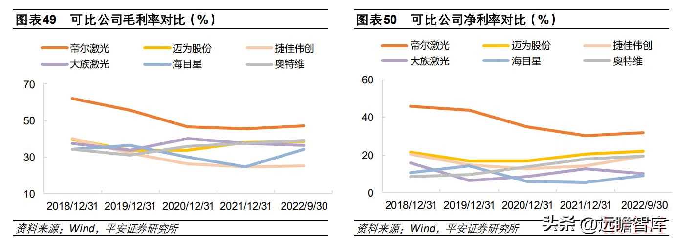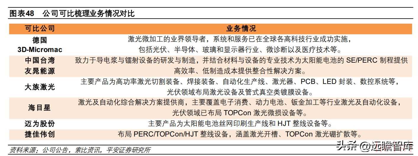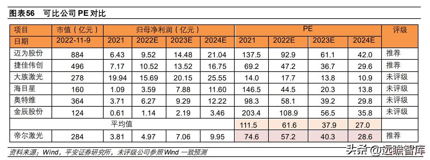 估值方面采用相對估值法,以邁為股份、捷佳偉創(chuàng)、大族激光、海目星、金辰股份等設(shè)備企業(yè)作為可比對象,公司 2022 年估值水平略低于可比公司平均值;考慮光伏激光設(shè)備應(yīng)用的快速放量及公司在此細分的龍頭地位,公司有望獲得相對更高的 估值水平。