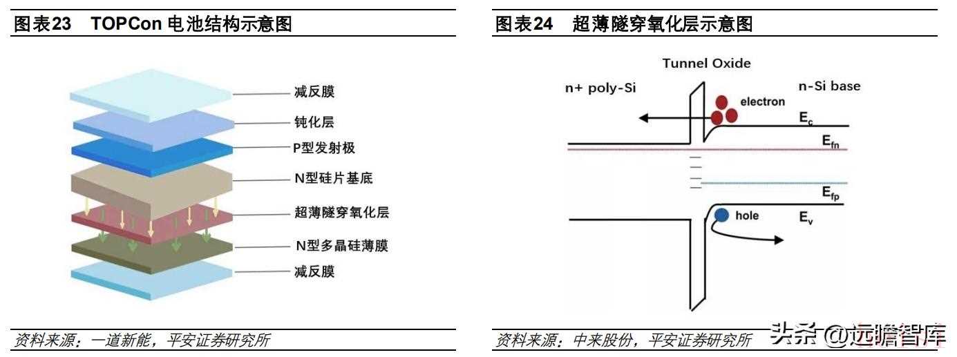第三代電池技術(shù)(產(chǎn)業(yè)化元年開啟)為 N型高效電池:包括 TOPCon、HJT、IBC 電池等,其鈍化接觸技術(shù)減少接觸復(fù)合。