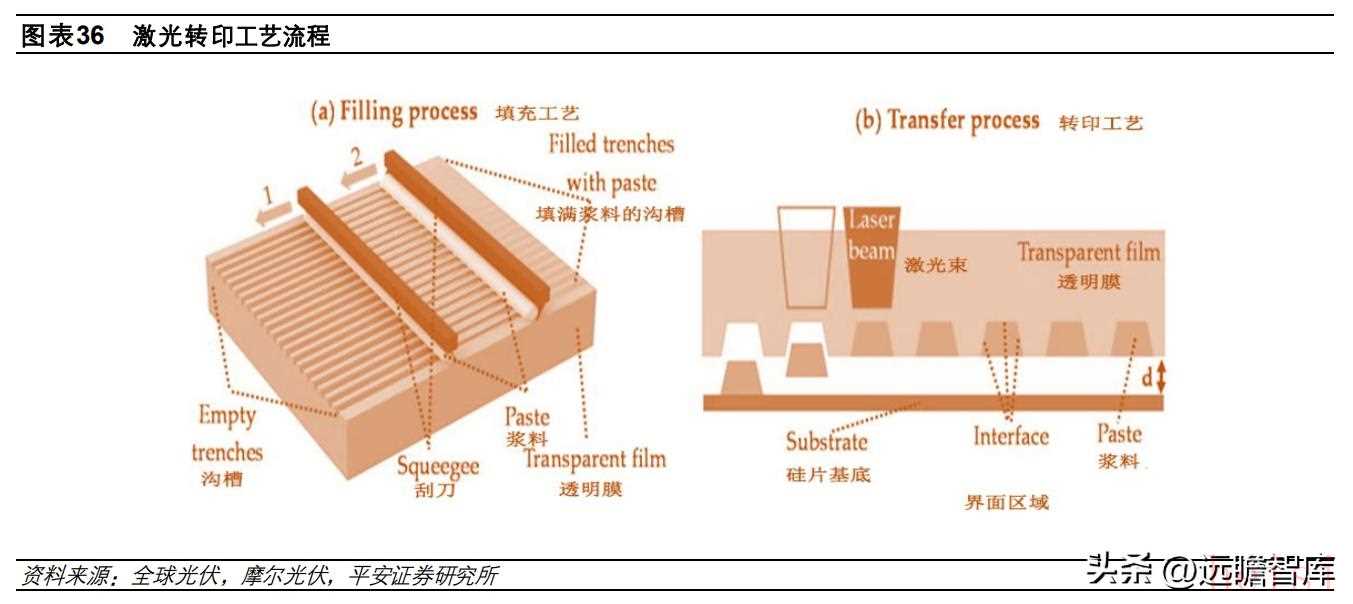 (1)激光轉(zhuǎn)印的柵線更細,可以做到 15-18um,節(jié)省銀漿用量約 30%+,對 N 型電池路線降銀耗更為明顯;