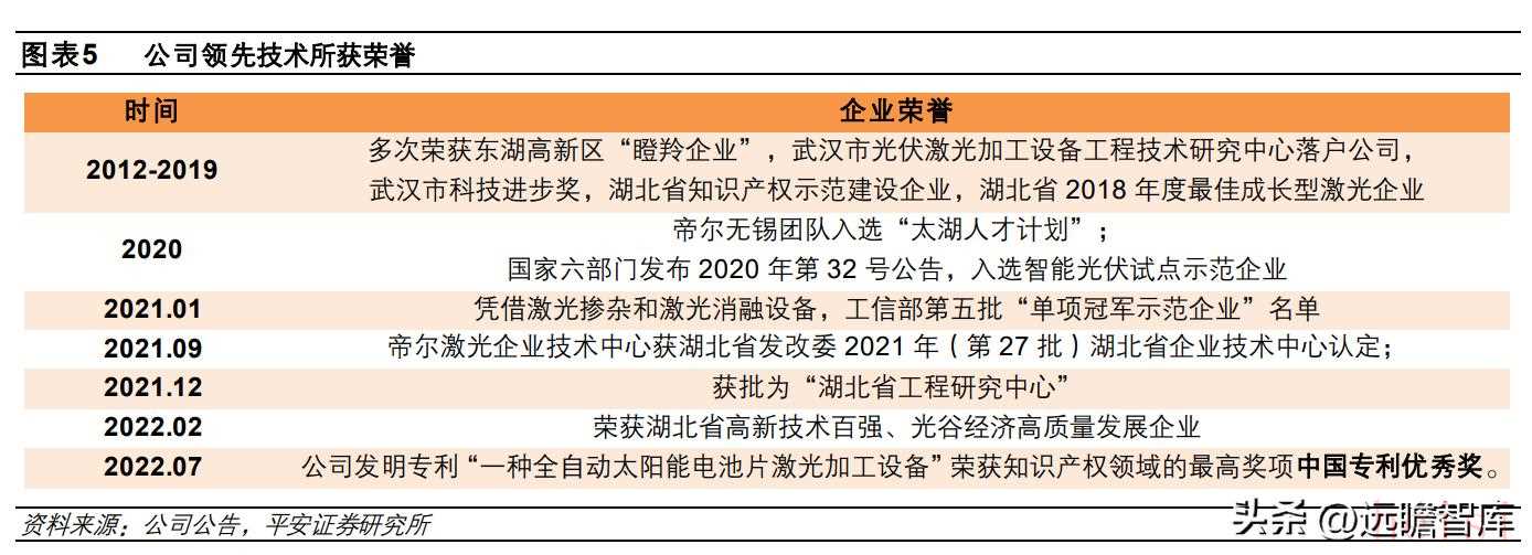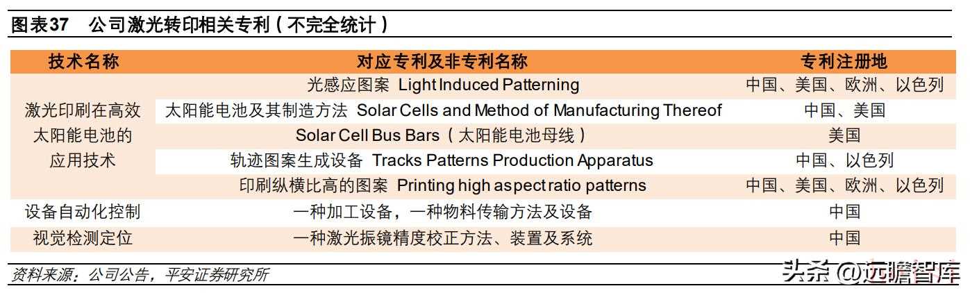 公司擁有深厚的研發(fā)技術(shù)壁壘、完善穩(wěn)定的人才體系、優(yōu)越的品牌影響力、豐富的客戶資源,長期專注于光伏領(lǐng)域,積淀了各類電池路線 Know-how 工藝,擁有大量境內(nèi)外專利,享有新技術(shù)客戶導(dǎo)入與綁定的先發(fā)優(yōu)勢,在 N 型高效時代其光伏激光主導(dǎo)優(yōu)勢有望延續(xù)。
