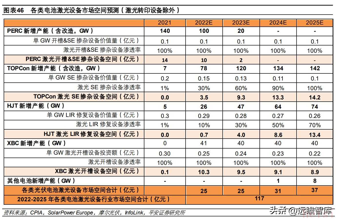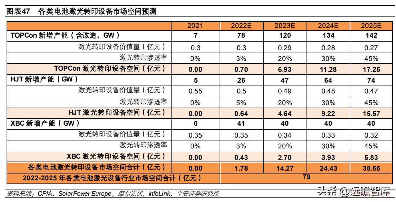 N 型光伏電池的快速放量,全新激光技術(shù)憑借高精度、高效率等優(yōu)勢,在 N 型電池的應(yīng)用逐步覆蓋 TOPCon SE 激光摻雜、 HJT LIR 激光修復(fù)、IBC 激光開槽、全電池路線激光轉(zhuǎn)印等,隨著新技術(shù)導(dǎo)入,激光設(shè)備單 GW 價值量較 PERC 電池將有望大幅增長,光伏激光設(shè)備市場空間進一步打開。