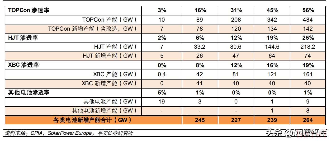 目前 N 型產(chǎn)品擴產(chǎn)放量趨勢明確,TOPCon 量產(chǎn)規(guī)模領(lǐng)先,HJT降本提效空間較大,IBC 技術(shù)延伸優(yōu)越,我們預(yù)計到 2025 年,TOPCon、HJT、IBC 電池市場滲透率有望分別達到 56%、25%、19%;2022-2025 年,TOPCon、HJT、IBC 電池新增產(chǎn)能分別約為 474GW、211GW、161GW。