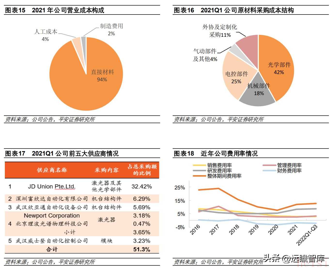 從成本與費用端看,公司營業(yè)成本中,直接材料成本占比超 90%,其次為人工成本和制造費用。原材料成本中,光學(xué)部件(激光器、振鏡、擴束鏡等)占比較大,其余為機械、電控、氣動部件和其他組件等。