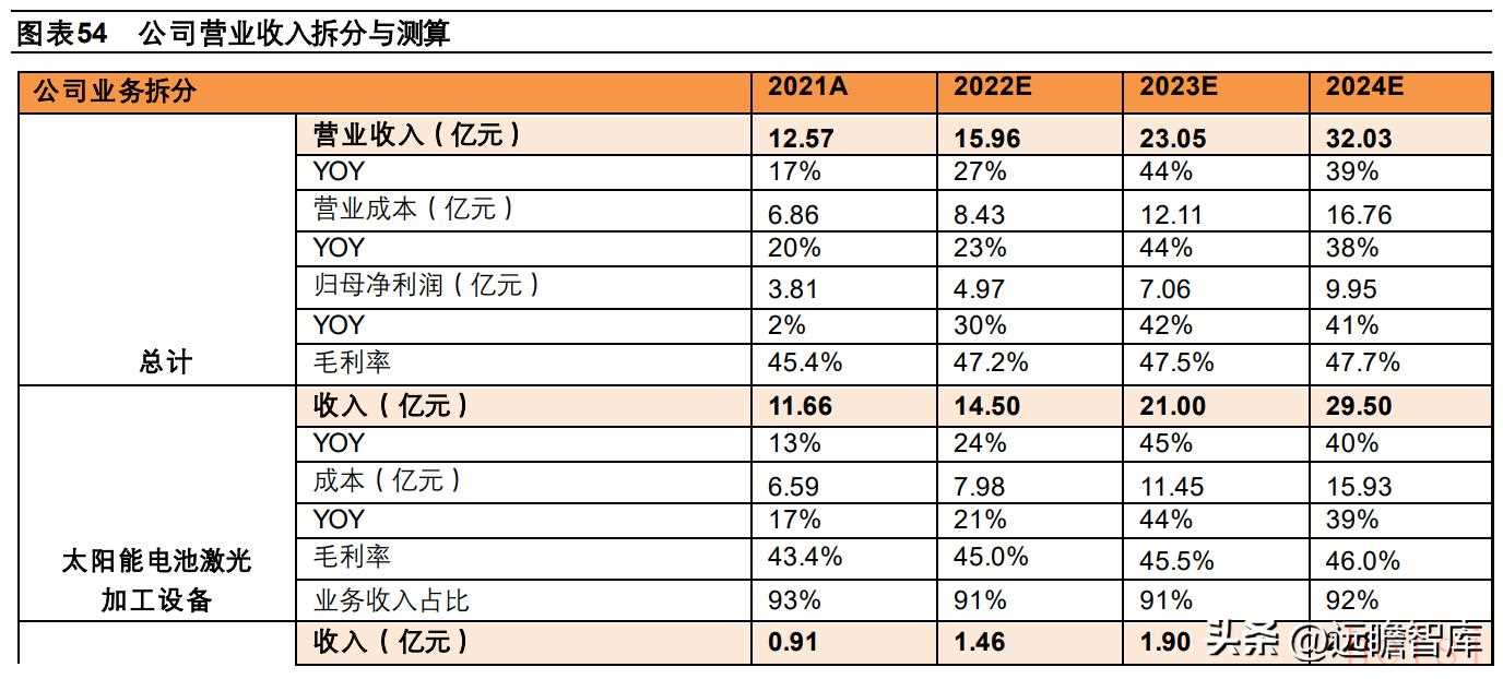 整體來看,預(yù)計公司 2022-2024 年營業(yè)收入有望達到 15.96、23.05、32.03 億元。其中太陽能電池 激光設(shè)備收入分別達到 14.5、21.0、29.5 億元,毛利率隨技術(shù)迭代略有提升;配件維修及技術(shù)服務(wù)持續(xù)增長,2022-2024 年營收增速約為 60%、30%、20%,毛利率在 70%左右;電子消費等非光伏行業(yè)板塊有望于 2023 年逐步確認收入,后續(xù) 增長勢頭有望加速。