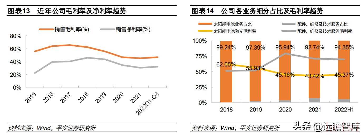 從業(yè)務(wù)細分來看,公司太陽能電池激光加工設(shè)備業(yè)務(wù)占比超90%。2022上半年,太陽能電池激光加工設(shè)備營收占比94.35%,業(yè)務(wù)毛利率為 45.37%;配件、維修及技術(shù)服務(wù)營收占比 5.65%,業(yè)務(wù)毛利率為 69.85%。預(yù)計隨著新型電池激光設(shè)備逐步出貨與確認收入,公司盈利能力有望繼續(xù)提升。