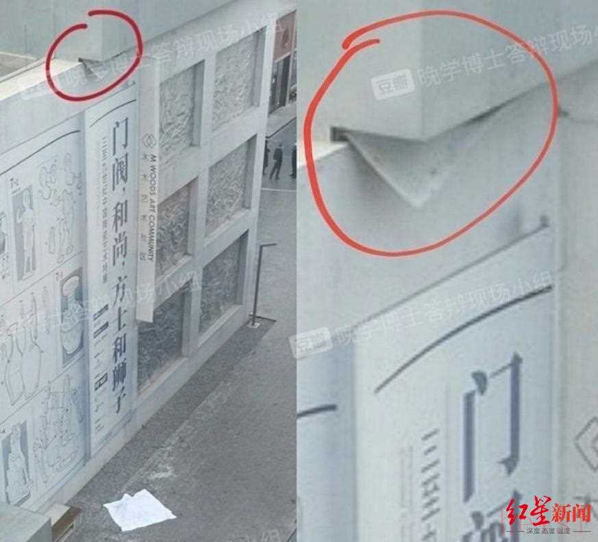 一位自稱現(xiàn)場目擊者的網(wǎng)友稱,布展工人并非依靠欄桿、圍墻等失足跌落,而是從頂樓搭建的一座外觀形似集裝箱的裝置底部滑落,事發(fā)時,這一裝置底部突然裂開。