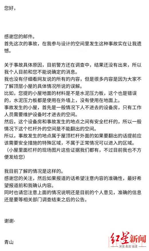 對此,設(shè)計師青山周平在回復(fù)紅星新聞的采訪郵件中稱,“首先這次的事故,在我參與設(shè)計的空間里發(fā)生這種事故實在讓我遺憾?!?/p>