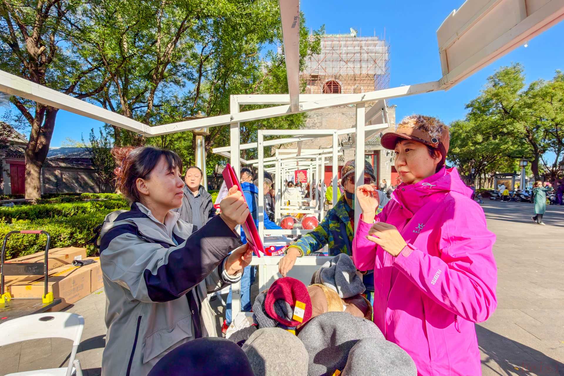 晴好天氣,鐘鼓樓文化廣場人氣十足。廣場一側(cè),17個精品展位一字排開。眾多老字號帶來“經(jīng)典內(nèi)核+創(chuàng)新呈現(xiàn)”的組合,北京琺瑯廠的非遺景泰藍老物件與文創(chuàng)新品同臺展出;四聯(lián)美發(fā)自研品牌鉑蘊系列美發(fā)產(chǎn)品、大北照相館的優(yōu)惠攝影套系,精準(zhǔn)匹配市民精致生活需求;吳裕泰特色茶葉與創(chuàng)新茶點、同日升招牌“二八醬”、便宜坊燕京八景禮盒,以經(jīng)典風(fēng)味融合創(chuàng)新表達備受青睞;京花布鞋、盛錫福帽子各具特色,將傳統(tǒng)工藝與潮流設(shè)計相融合,滿足不同年齡段消費者需求。