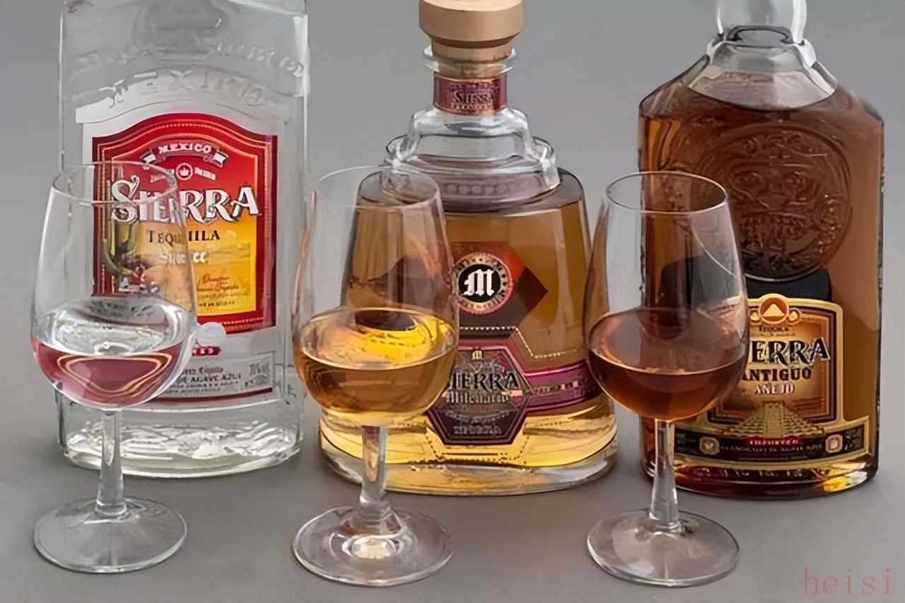 龍舌蘭酒的酒精度一般為 38%-40%,當(dāng)然 31%-50% 這個范圍也是正常的。龍舌蘭酒也有等級之分,根據(jù)陳年時間的不同,最常見的分類有 Blanco/Plata(沒有陳年要求,一般為無色)、Reposado(至少陳釀 2 年)和 Anejo(至少 1 年,顏色最深)(如圖)。
