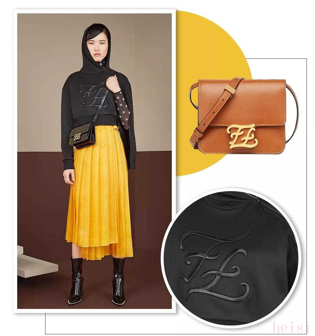 Fendi的衛(wèi)衣上面印的是Karl Lagerfeld在1981年設(shè)計的斜體版FF logo,名叫“Karligraphy”,同樣的logo在包包上也能看到。