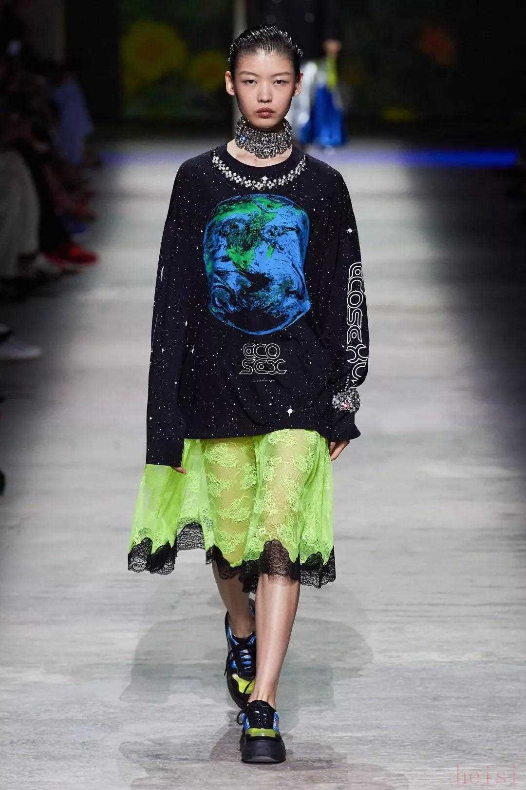 Christopher Kane在本季秀場上發(fā)布的衛(wèi)衣也是寬松的長款,上面的星球圖案既復(fù)古又有未來感,搭配裙子特別好看。